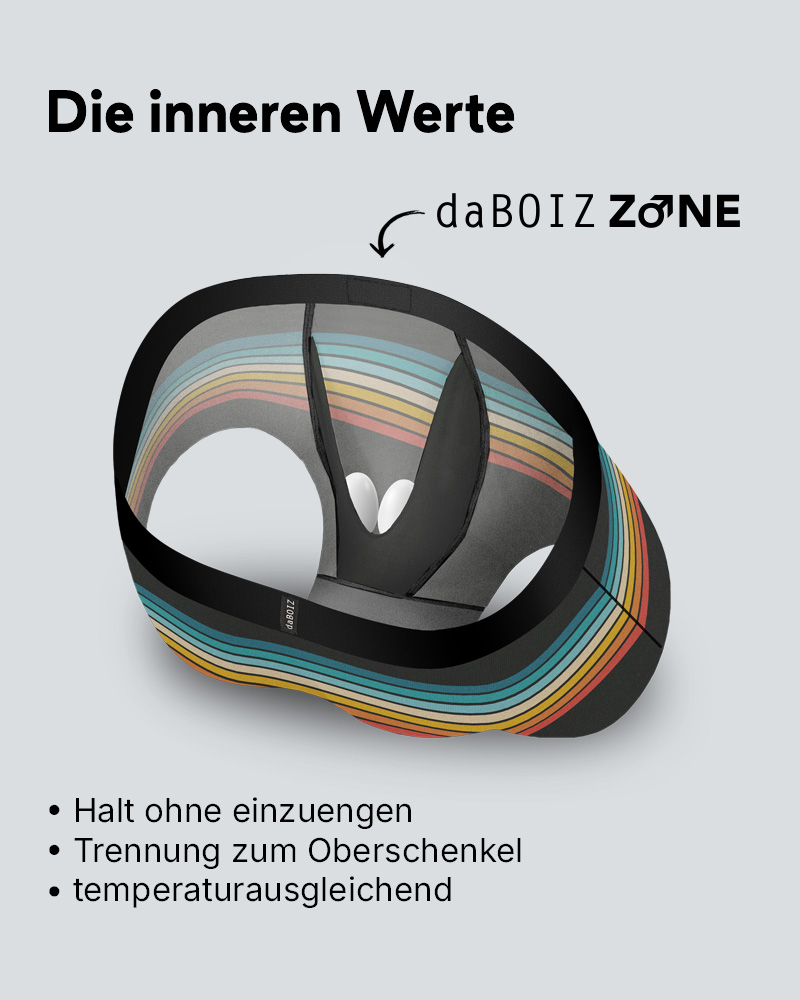 Die einzigartige "daBOIZ-ZONE" im Inneren schafft eine Trennung zum Oberschenkel, so entsteht kein Hautkontakt im Schritt und damit auch keine Reibung und kein Schweiß.