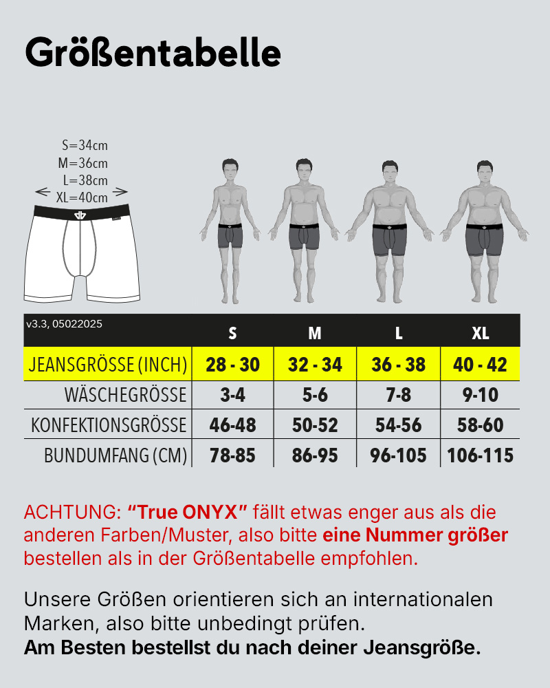 ACHTUNG: "True ONYX" fällt etwas enger aus als die anderen Farben/Muster, also bitte eine Nummer größer bestellen als in der Größentabelle empfohlen.